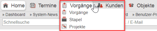 - Vorgänge: In diesem Bereich finden Sie eine Übersicht sämtlicher Einzelvorgänge (siehe „Vorgänge“).