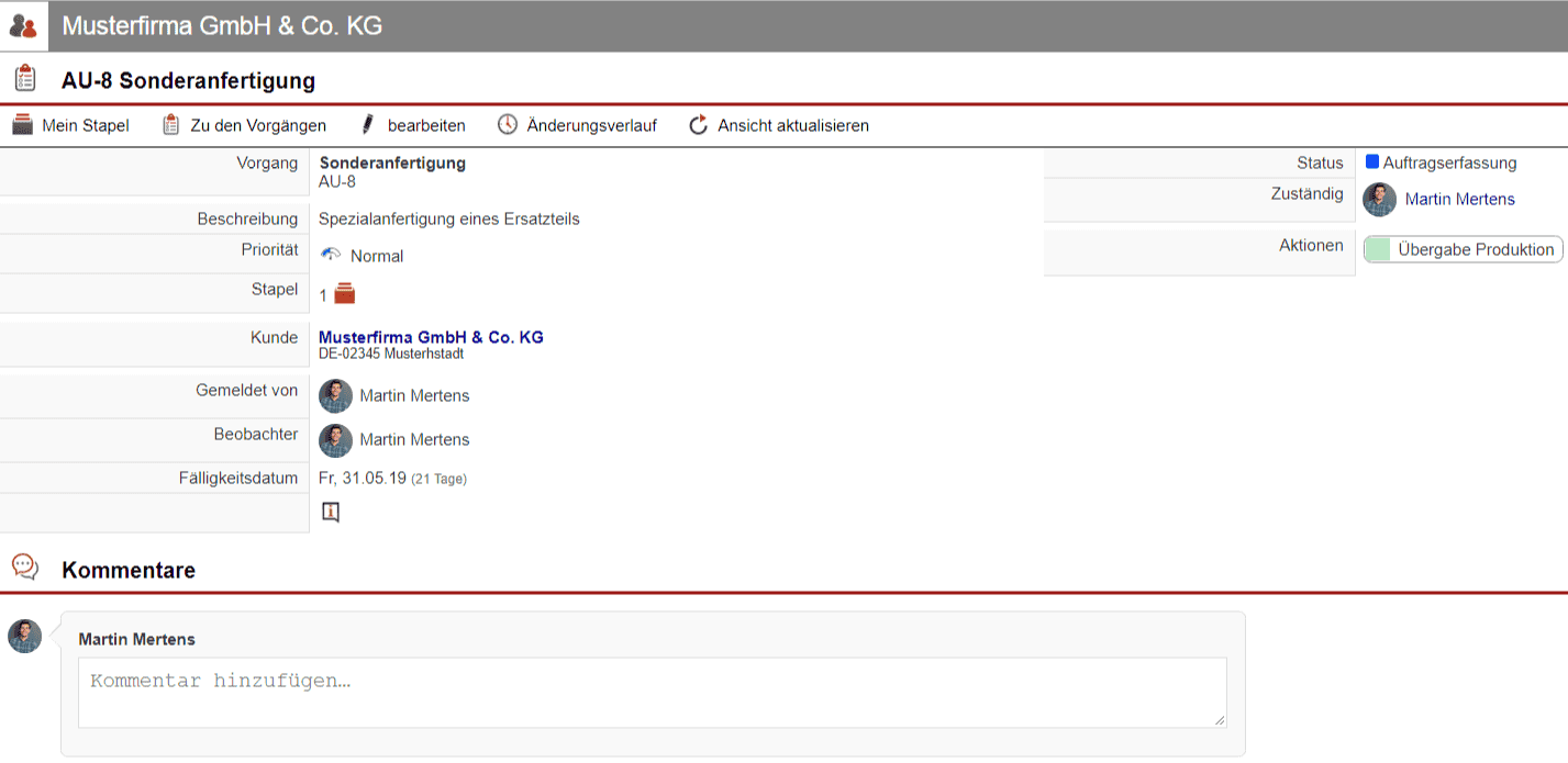 Nach dem Setzen dieses „Startpunkts“ beginnt nun der Durchlauf durch die verschiedenen Abteilungen. Mit dem Druck auf den Prozess Button „Übergabe Produktion“ erhält der Produktionsleiter den Staffelstab. Er ist verantwortlich für die Einplanung des Auftrags und die Auswahl seines Mitarbeiters, der das Werkstück herstellen soll. Als nächstes macht sich der gewählte Produktionsmitarbeiter an die Arbeit und quittiert seine erledigte Aufgabe mit einem Klick auf „Qualitätskontrolle“, sodass der Meister zur Abnahme gerufen wird. Gibt dieser sein OK, schiebt er den nächsten Schritt des Auftrags wieder dem Kundenbetreuer zu, welcher die Endabnahme zusammen mit dem Auftragsgeber durchführt. Auch bei anfallenden Korrekturwünschen des Auftraggebers ist ein extra Prozess Button vorgesehen, der den Auftrag, zusammen mit einem Kommentar des Kundenbetreuers, wieder zum Produktionsleiter überträgt, um die folgenden Schritte wiederholt durchlaufen zu lassen. Im besten Fall wird das Werkstück natürlich sofort positiv vom Kunden in Empfang genommen, wodurch der Innendienst für die Rechnungsstellung benachrichtigt und der Auftrag schließlich an die Buchhaltung überstellt wird. Diese stellt ihn mit „abgeschlossen“ nach erfolgtem Zahlungseingang fertig.
