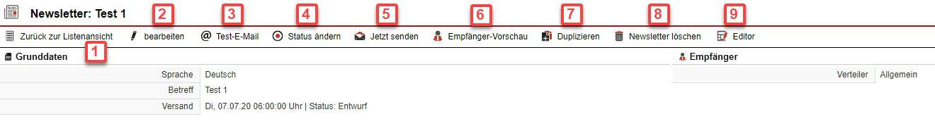 Nachdem Sie einen bestehenden Newsletter [Abb. 2/2] geöffnet haben, kommen Sie in seine spezifische Übersichtsmaske. Hier stehen Ihnen verschiedene Funktions-Buttons zur Verfügung: