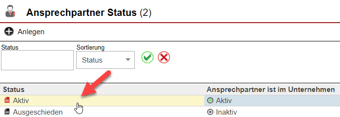 Hier ergänzen Sie einen neuen Status für den Einsatz bei Ansprechpartnern. Zusätzlich geben Sie über eine Checkbox an, ob der Ansprechpartner mit diesem Status als aktiver Mitarbeiter im Unternehmen gelistet werden soll oder nicht.