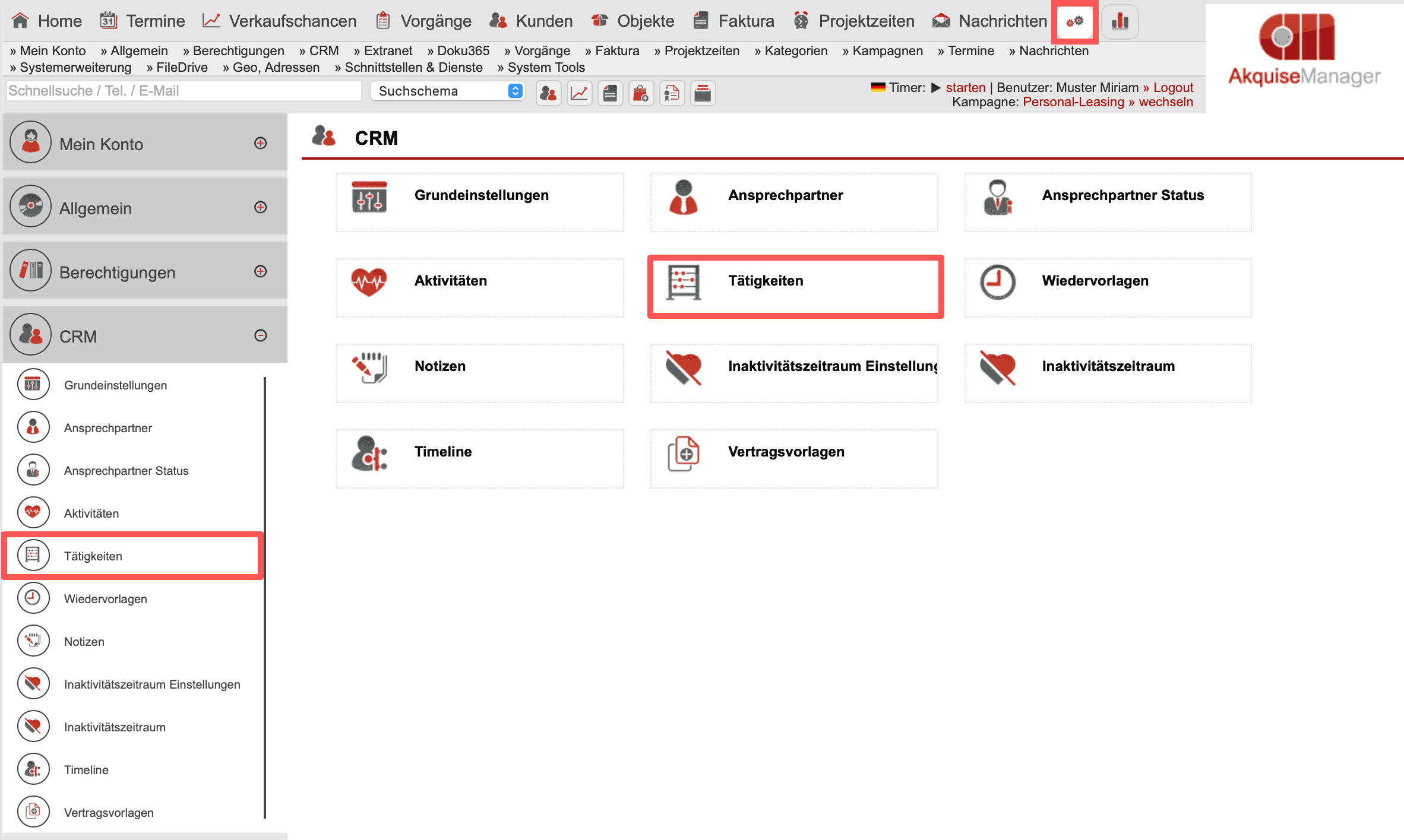 Im Hauptmenüpunkt „Einstellungen“ finden Sie nach einem Klick auf den Untermenüpunkt „CRM“ den Bereich zum Anlegen von „Tätigkeiten“. Sie öffnen diesen durch einen Klick auf das gleichnamige Icon. Der Einstellungsbereich „Tätigkeiten“ gehört zum Funktionskomplex „Schlagzahlmanagement“. Ergänzende Informationen hierzu finden Sie unter „Das Schlagzahl-Management“ und „Effekte“.