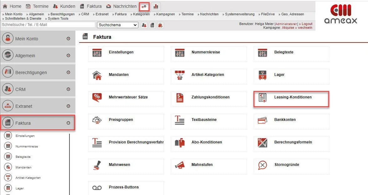 Klicken Sie im Hauptmenüpunkt „Einstellungen“ auf den Untermenüpunkt „Faktura“ und dessen Bereich „Leasing-Konditionen“, um neue Leasing-Konditionen anzulegen oder bestehende Konditionen zu bearbeiten.