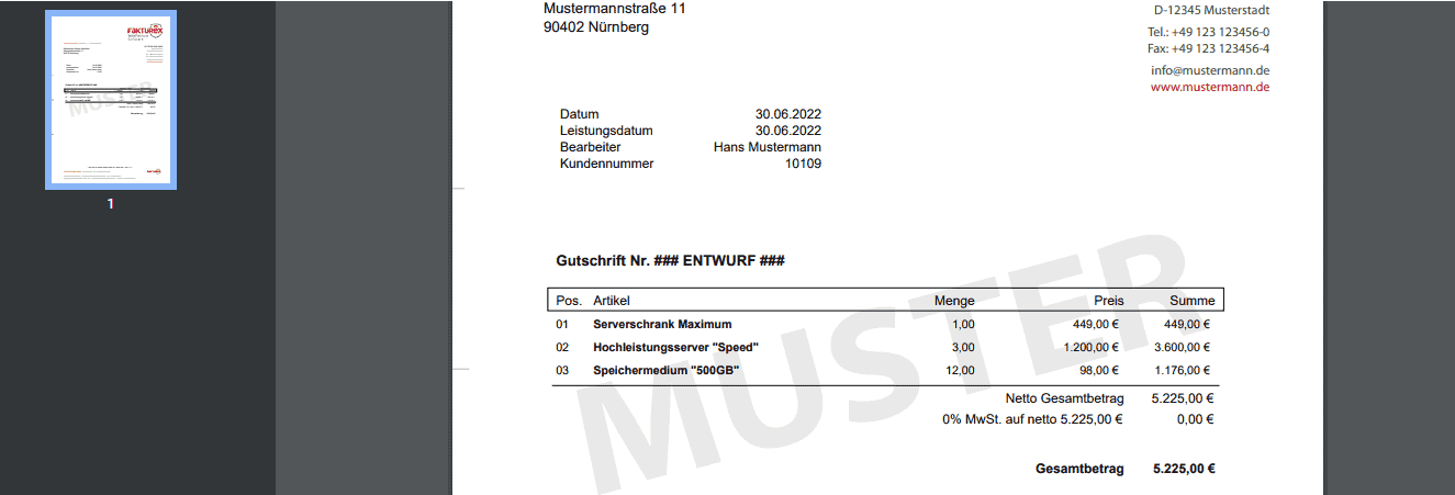 Das Schaubild zeigt eine beispielhafte Gutschrift eines Händlers für Netzwerktechnik. In der Voransicht können Sie alle Informationen überprüfen, bevor Sie den Beleg versenden. Als Briefpapier wurde in den Einstellungen ein Muster Briefpapier verwendet, welches individuell abgeändert werden kann. Unter Briefpapier erhalten Sie eine Vorgangsbeschreibung zur Änderung von diesem.