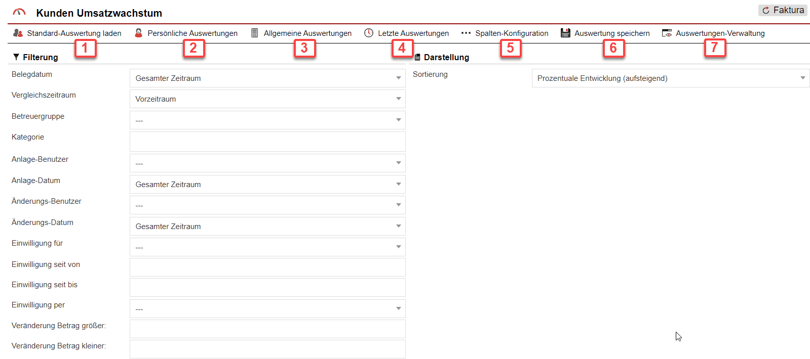 In der Statistik „Kundenumsatzwachstum“ können die bei Kunden in einem bestimmten Zeitraum erwirtschafteten Umsätze mit denen aus einem anderen verglichen werden. Hierbei errechnet das System auch die Abweichungen in Prozent und stellt sie dar. Erreichbar ist die Statistik „Kundenumsatzwachstum“ im Hauptmenüpunkt „Statistik“ unter „Faktura“ bei „Kundenumsatzwachstum“.