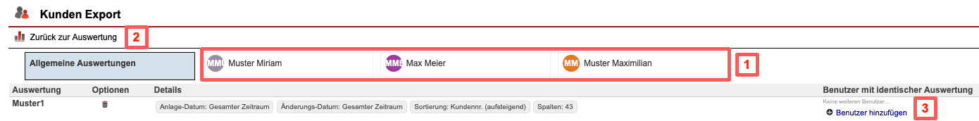 Im sich öffnenden Bereich [Abb. 6] sind Sie hier in der Lage, gespeicherte Auswertungen nach Benutzern zu filtern [Abb. 6/1]. Über die Schaltfläche „Zurück zur Auswertung“ kommen Sie zur Auswertungsübersicht [Abb. 6/2]. Über die Schaltfläche „Benutzer hinzufügen“ [Abb. 6/3] weisen Sie einer vorhanden Auswertung einen Benutzer zu.